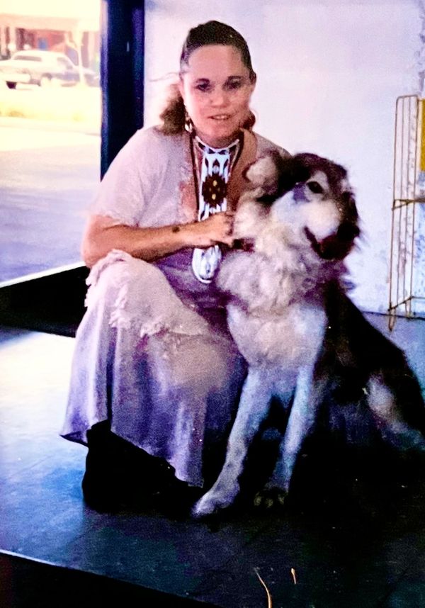 My spiritual teacher Touch Hearts Woman, Melody Addams, and her wolf Spirit. Yes Spirit is 100% wolf. Phoenix AZ 1993